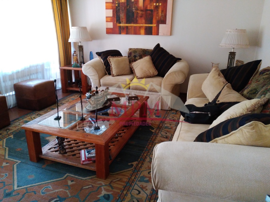 Hall de accesos, baño de visitas, separación con puerta de madera vidriada, living y comedor separados con piso flotante con salida hacia la terraza, dormitorio principal muy amplio con salida a la terraza, aire acondicionado, walking closet, amplio baño, segundo dormitorio muy buen tamaño con baño completo, closet ropa blanca, cocina amoblada en base muros y equipada, con un amplio comedor de diario, luces empotradas en la cocina y comedor de diario, logia cerrada y techada, pieza de servicio con baño.