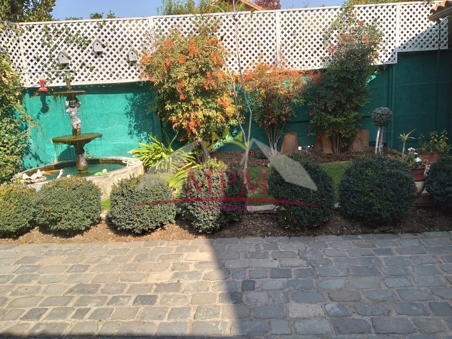 Ante jardín con fuente de agua, jardín formado, estacionamiento para 5 autos.